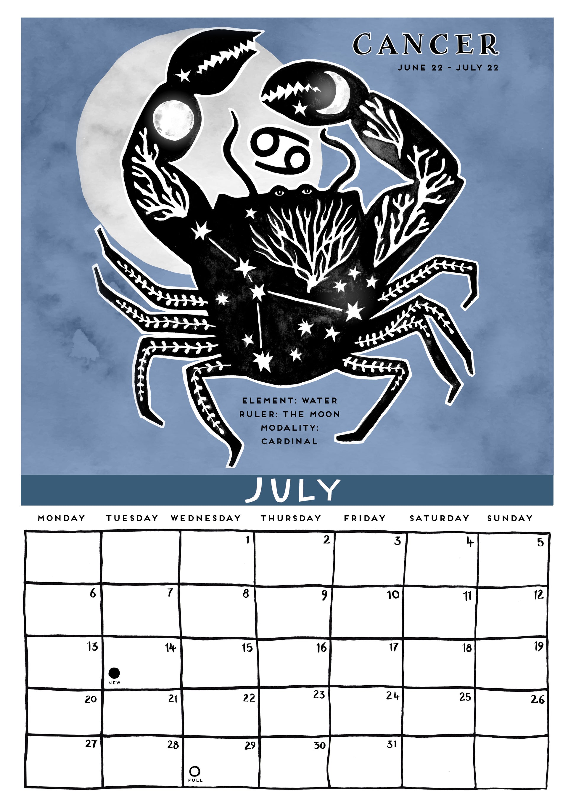 Each month includes a hand-painted illustrated Zodiac sign, alongside the dates, info and elements for the sign. New moon and full moon dates are included each month.