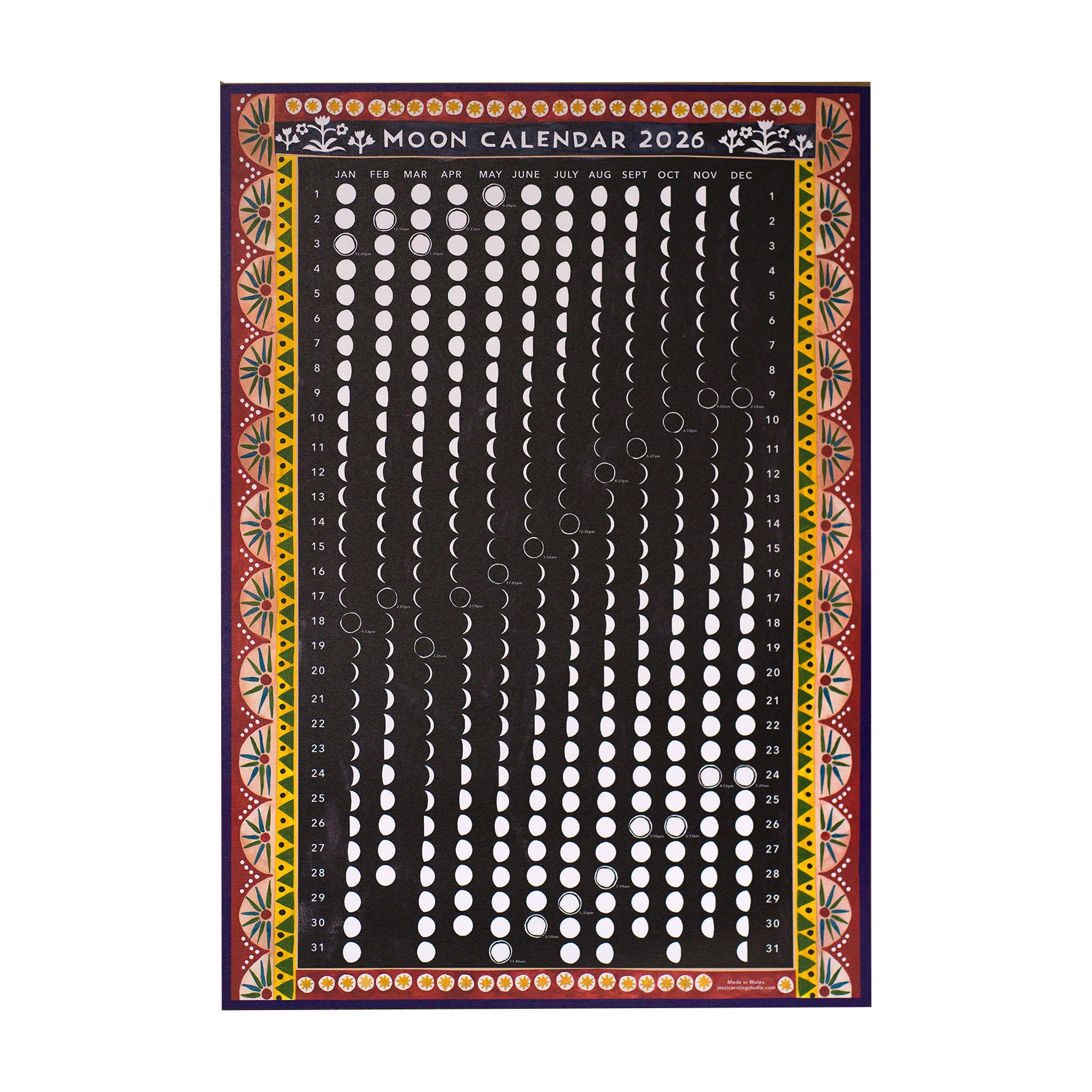 This printed one-page moon calendar has been hand-painted at my studio in Wales. Perfect as a print for a wall, or to give to a loved one as a gift!