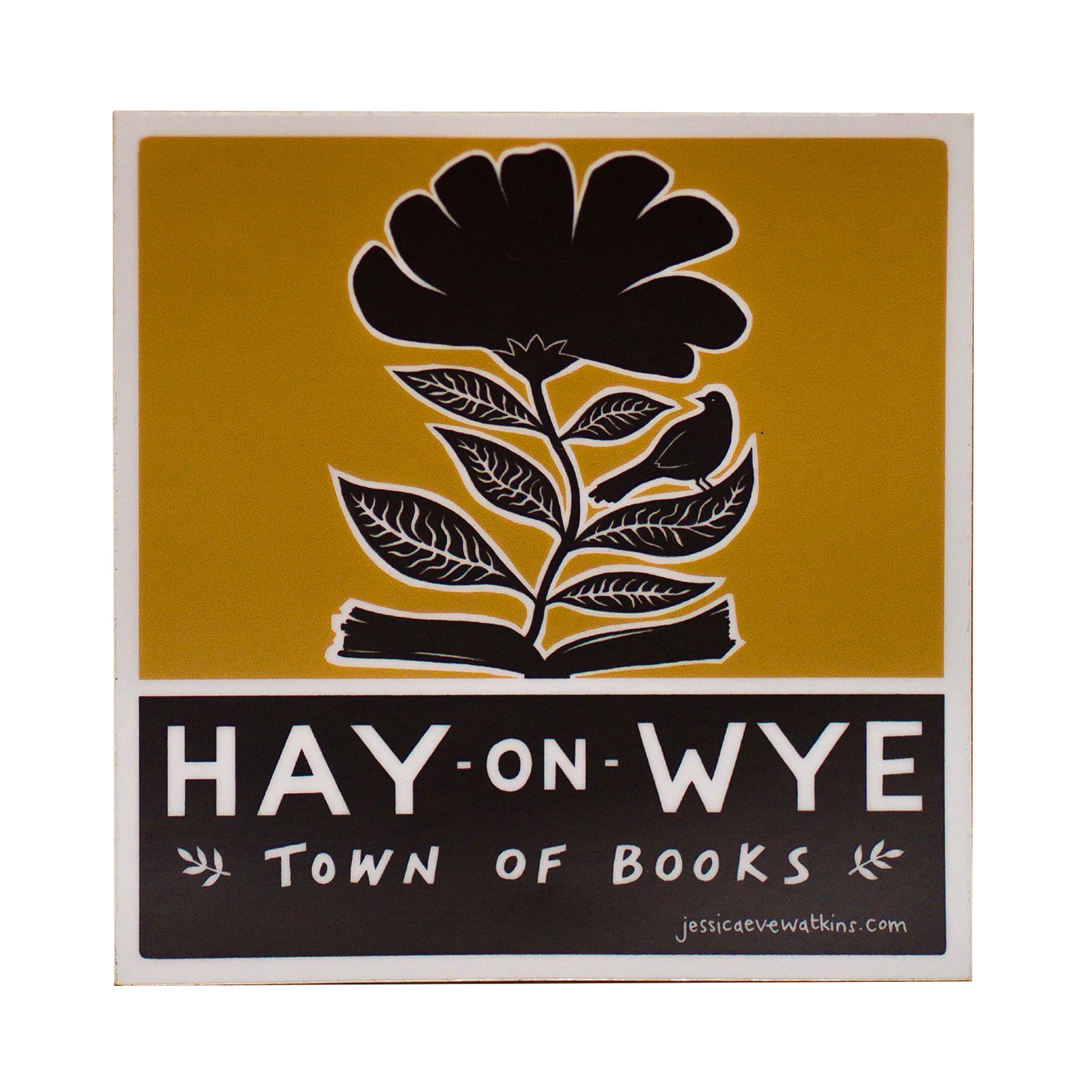10cm x 10cm, high quality vinyl sticker in yellow ochre, brown and white.