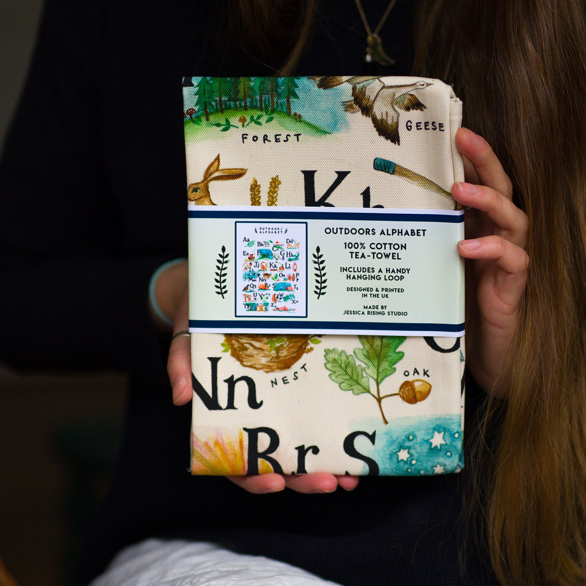 A hand illustrated, cotton tea towel, featuring our hand-painted Outdoors Alphabet.