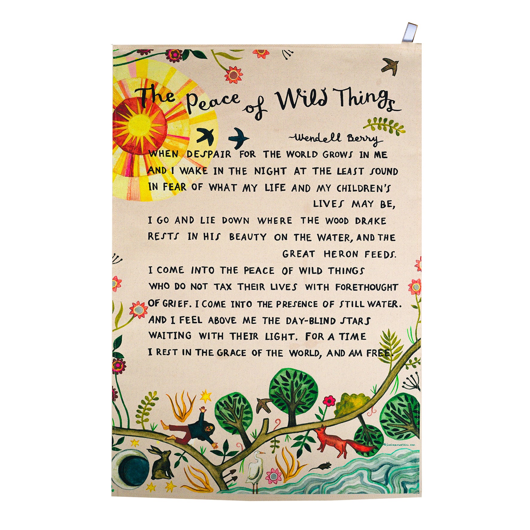 A hand-illustrated tea towel, featuring Wendell Berry’s Peace of Wild Things poem.